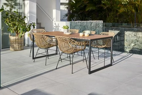 Bord: Aluminium, stål och konstträ. B90 x L190 x H74 cm. Stol: Stål och konstrotting.