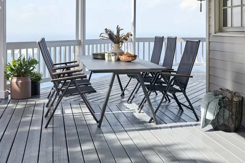 Bord: Aluminium och konstträ. B100 x L220 x H74 cm. Stol: Aluminium och textilene. 6 positioner. Hopfällbar.