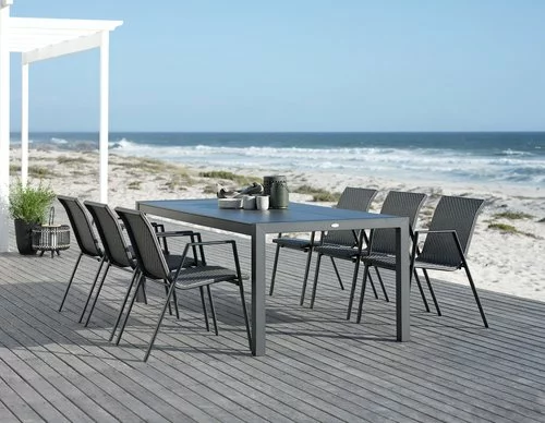 Aluminium och DURAWOOD® kompositträ. DURAWOOD® är ett slitstarkt kompositmaterial som består av FSC® hårdträfiber och plast. B100 x L214 x H74 cm. Stol: Stål och konstrotting. Stapelbar.
