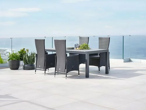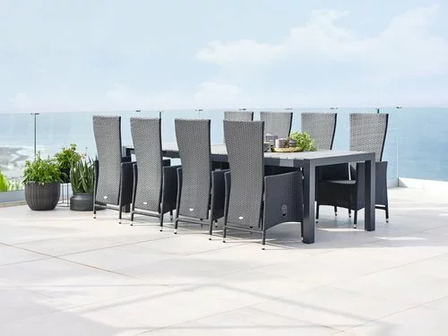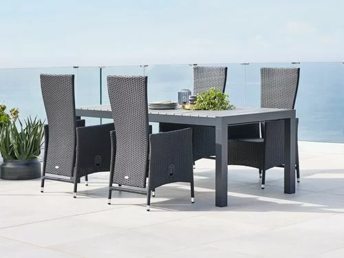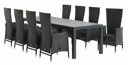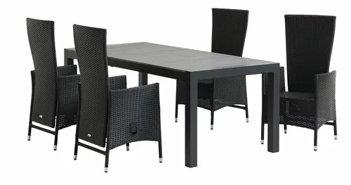 Bord: Aluminium och konstträ. Inkl. 1 klaff, som kan förvaras under bordsskivan. B95 x L205/275 x H76 cm. Stol: Aluminium och konstrotting. Med steglös ryggjustering.