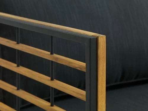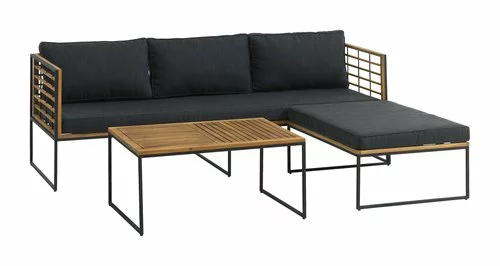Bord: Galvaniserat stål och oljat FSC® hårdträ. B60 x L90 x H43 cm. 3-sits soffa med schäslong: Galvaniserat stål och oljat FSC® hårdträ. Kan spegelvändas. Inkl. exklusiva dynor med slitstarkt, strukturvävt överdrag.