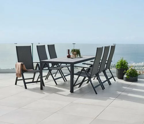 Bord: Aluminium och konstträ. B90 x L205 x H74 cm. Stol: Aluminium och konstrotting. 6 positioner. Hopfällbar.