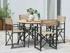 Bord: Aluminium och konstträ. Ø130 x H74 cm. Stol: Stål och textilene. Hopfällbar.