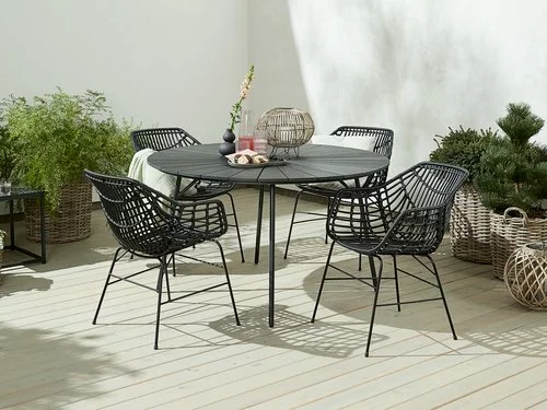 Bord: Aluminium, konstträ och fibercement. Ø130 x H74 cm. Stol: Stål och konstrotting.