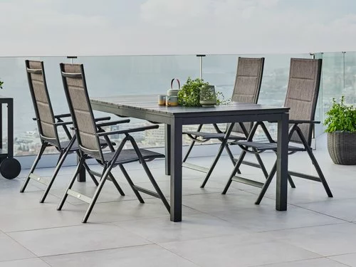 Bord: Aluminium och konstträ. Inkl. 2 klaffar, som kan förvaras under bordsskivan. B95 x L206/319 x H76 cm. Stol: Aluminium, textilene och snabbtorkande skumstoppning. 6 positioner. Hopfällbar.