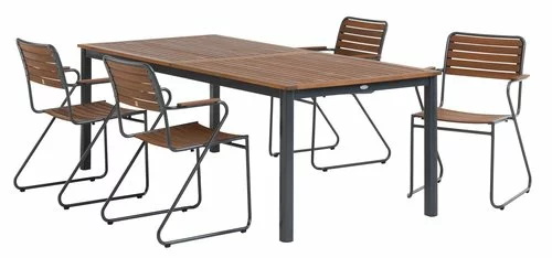 Bord: Aluminium och oljat FSC® hårdträ. Inkl. 1 klaff, som kan förvaras under bordsskivan. B100 x L210/300 x H75 cm. Stol: Aluminium och oljat FSC® hårdträ. Stapelbar.