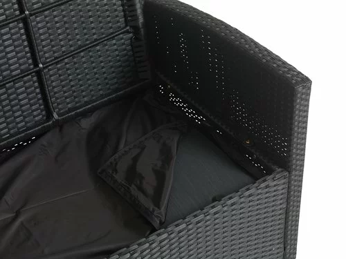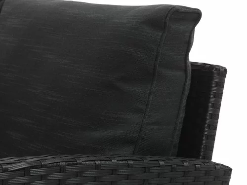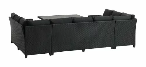 Bord: Stål, konstträ och konstrotting. B82 x L120 x H67 cm. 9-sits soffa: Stål och konstrotting. Med förvaringsutrymme och vattentät förvaringsväska till dynorna. Inkl. exklusiva dynor med slitstarkt, strukturvävt överdrag.