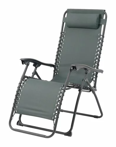 Stål och polyester. Steglös justering av stolsrygg och benstöd. Hopfällbar.