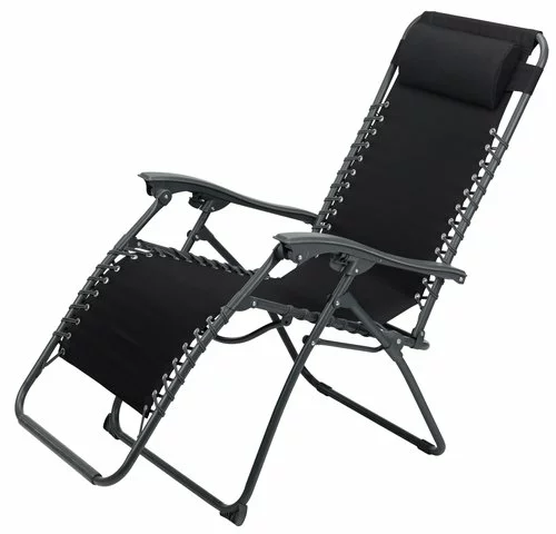 Stål och polyester. Steglös justering av stolsrygg och benstöd. Hopfällbar.