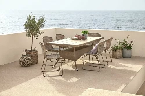 Bord: Stål, konstträ och konstrotting. B96 x L200 x H74 cm. Stol: Stål och konstrotting.
